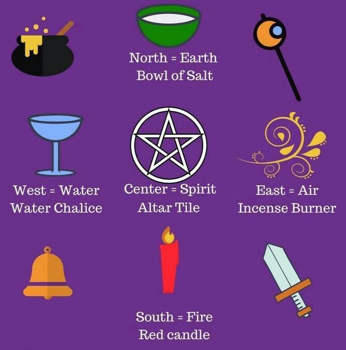 Place the bowl of salt in the North position. Place the incense in the East position. Place the candle in the South position. Place the bowl or chalice of water in the West position. IF you have a pentacle, place it in the middle.